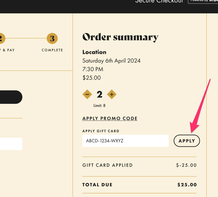 Paste your unique gift card number into the box, and click ‘Apply’.